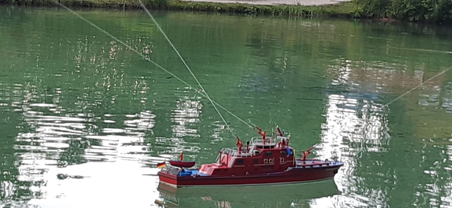 Das Modell - ein Bausatz der Firma GRAUPNER - im Massstab 1:33 hat eine Länge von 980mm und Breite 320mm. Mit einem Bugstrahler vorne und zwei Schottelantriebe im Heck ist das Boot sehr wendig.